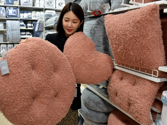 양털 같은 플리스 소재 패션이 최근각광 받고 있는 가운데, 부산지역 롯데마트에서 뽀글뽀글한 플리스 소재의 쿠션을 선보여 고객들에게 큰 인기를 얻고 있다.