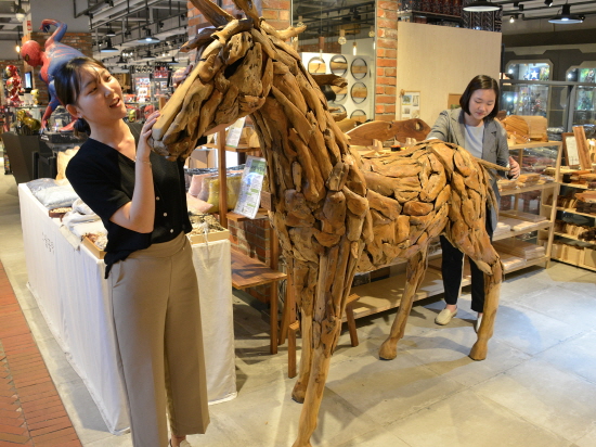 롯데백화점 부산본점 7층 빌리지 7에 위치한 오월공방 매장에 나무 조각을 붙여 만든 말 작품을 전시, 판매해 눈길을 끌고 있다.