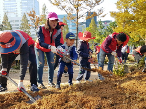 어른과 어린이로 조를 이룬 봉사자들은 전문가로부터 도심 공원의 중요성을 전해 들은 뒤 식재 요령을 익혔다.