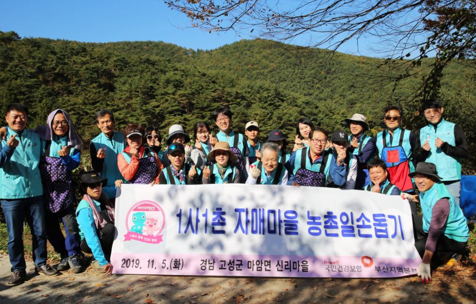 국민건강보험공단 부산지역본부는 5일 ‘1사 1촌’ 자매마을인 경남 고성군 마암면 신리마을에 위치한 참다래 농장에서 참다래 수확 봉사활동을 펼쳤다