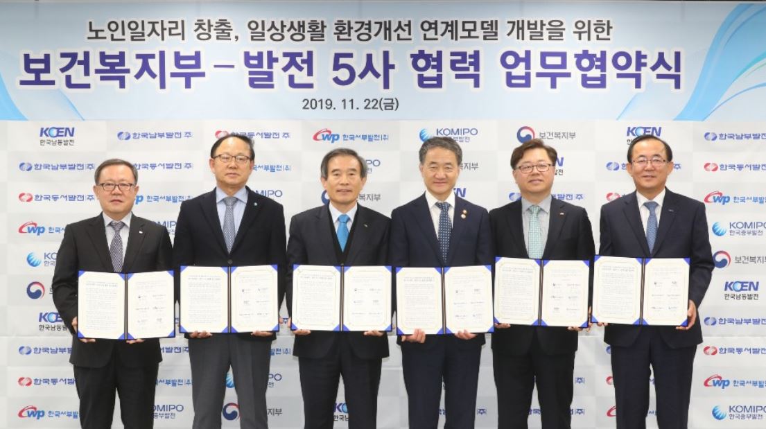 한국남동발전은 지난 22일 경기도 군포시 군포시니어클럽에서 보건복지부, 발전4사(남부, 중부, 서부, 동서)와 함께‘노인일자리 창출, 일상생활 환경개선 연계모델 개발을 위한 업무협약 체결식’을 가졌다.