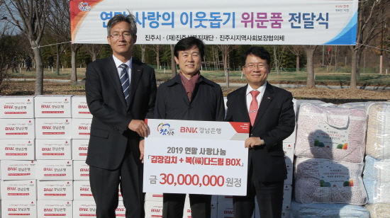 BNK경남은행(은행장 황윤철)은 5일 진주시(시장 조규일)에 ‘김장 김치ㆍ복(福)다드림박스’를 기탁했다.