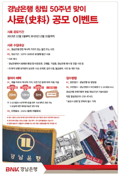 BNK경남은행(은행장 황윤철)은 내년 있을 창립 50주년(2020년 5월 22일)을 앞두고 ‘창립 50년 맞이 사료(史料) 공모 이벤트’를 진행하고 있다.