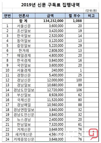 거제시가 공개한 신문 구독료 자료