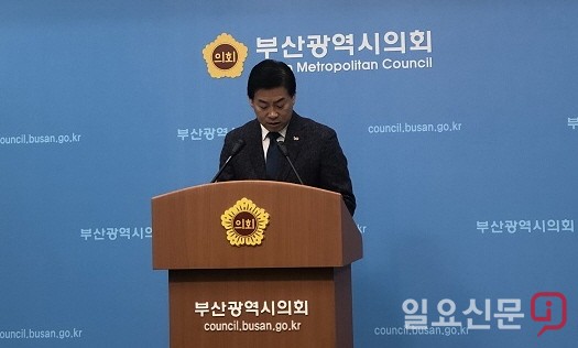 정정복 전 부산시축구협회장이 부산시의회 브리핑실에서 ‘부산시체육회장 후보자 공개토론 제안’ 기자회견을 갖고 있다.