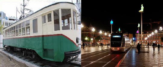 부산 동아대 석당박물관에 보존된 노면전차(왼쪽)와 프랑스 니스 ‘마세나 광장’을 가로지르는 트램의 모습.