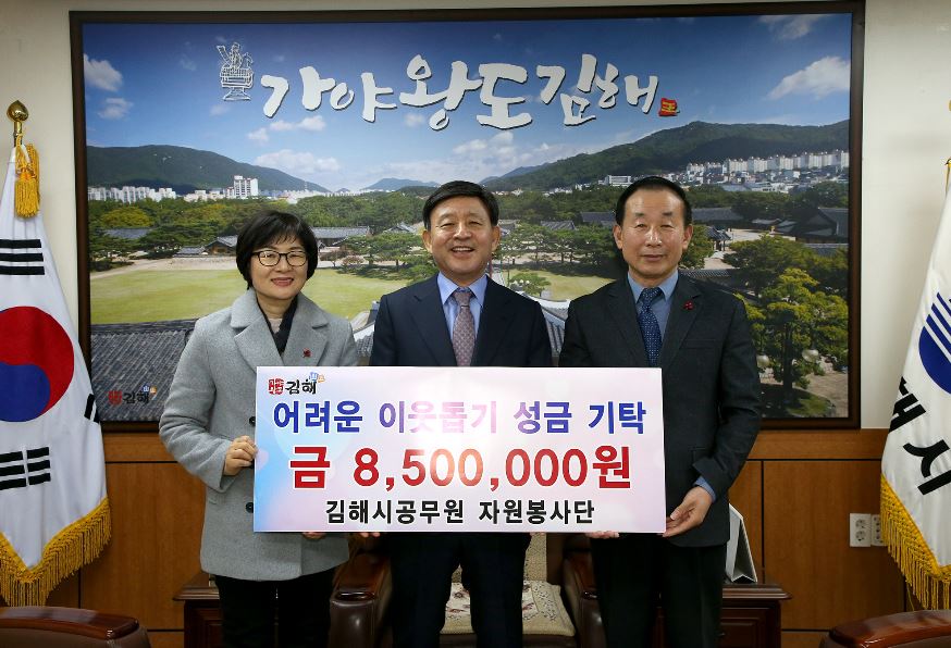 김해시 공무원 자원봉사단(단장 석외환)은 31일 이웃돕기 성금 850만원을 시에 기탁했다. 기탁된 성금은 관내 사회복지시설 3곳에 지원된다.