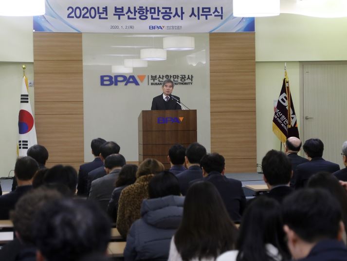 부산항만공사 남기찬 사장이 시무식서 신년사를 발표하고 있다.