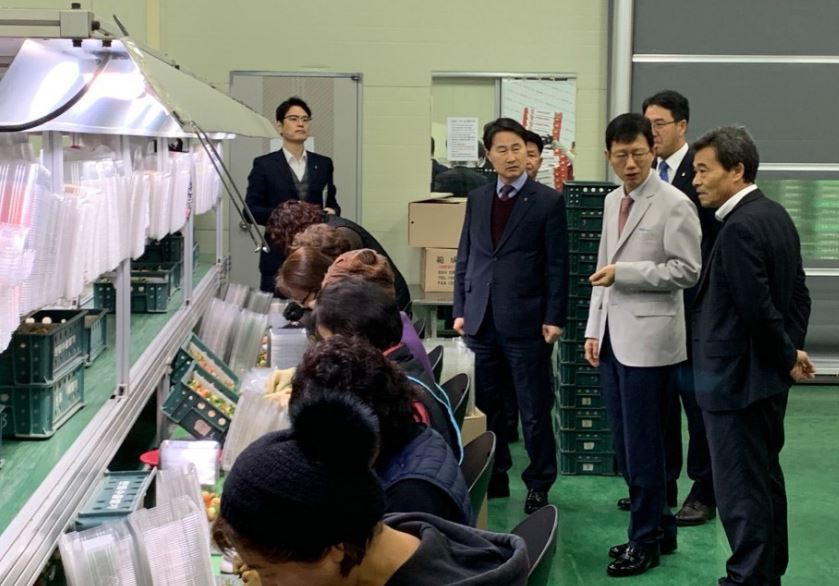 경남농협 윤해진 본부장이 8일 김해시 한림농협 딸기 선별장을 방문하고있다.