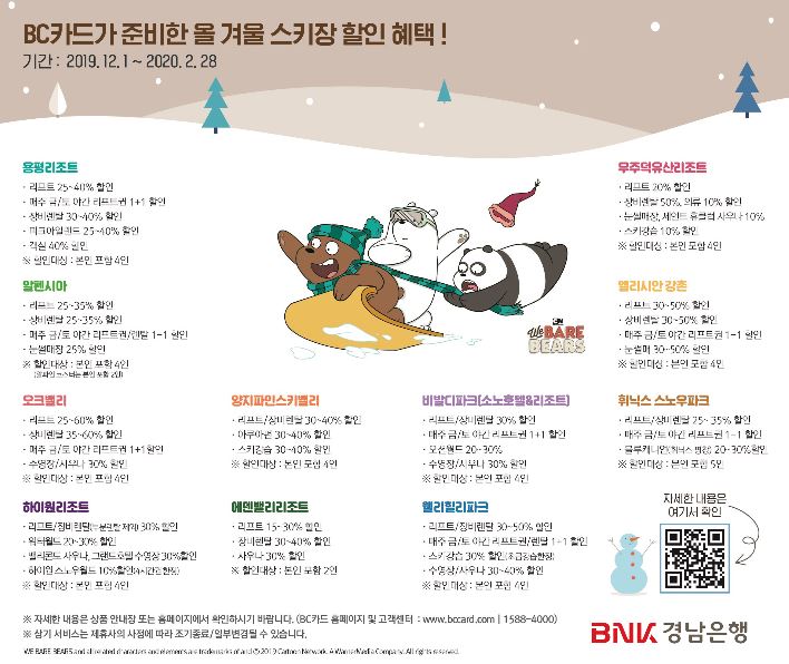 카드사업부 송영훈 부장은 “경남BC카드 가입 고객과 가족들이 전국 11대 스키장 할인 이벤트를 통해 겨울철 대표 레저 스포츠인 스키를 부담 없이 즐기기를 바란다. 앞으로도 고객들에게 알찬 혜택을 제공하기 위해 다양한 이벤트를 지속적으로 선보이겠다”고 말했다.