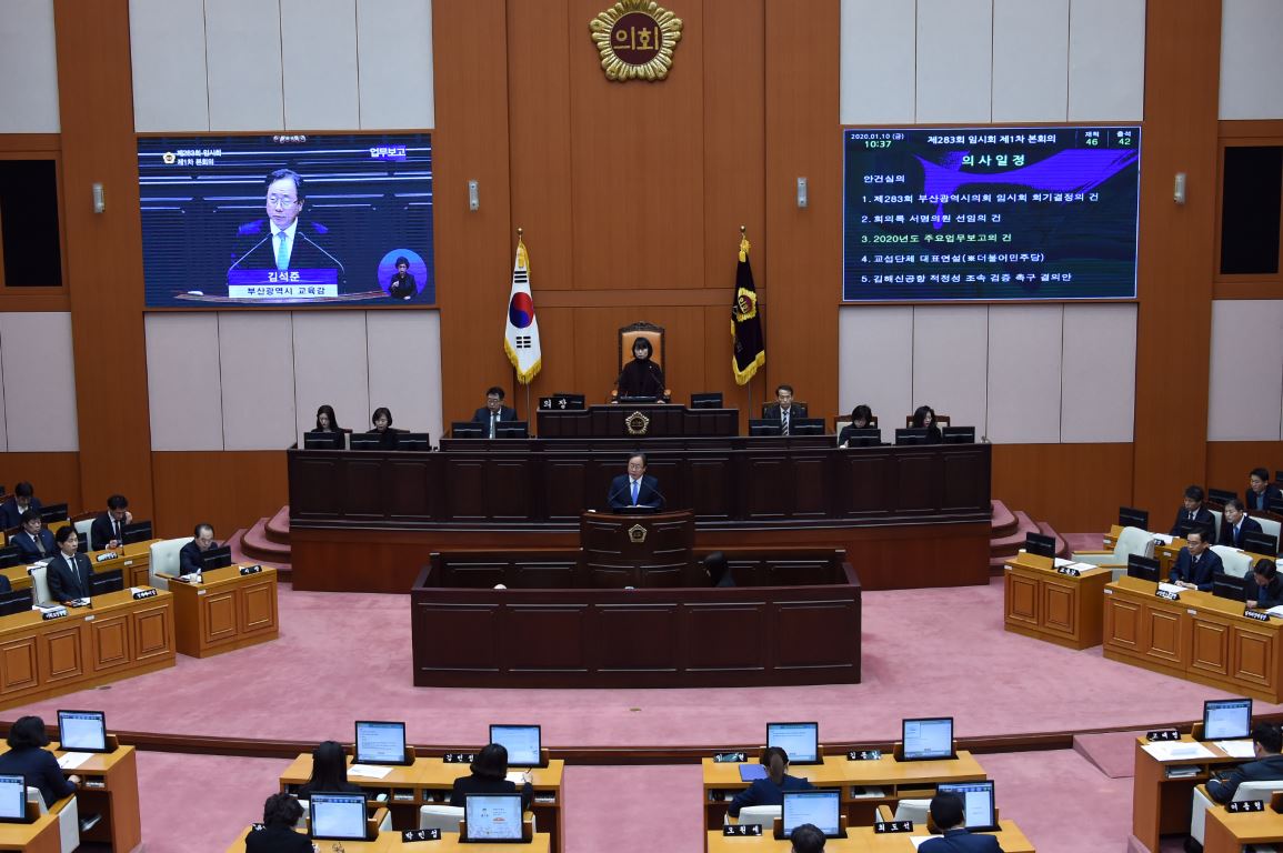 김석준 부산시교육감이 지난 10일 오전 부산시의회 본회의장에서 올해 처음 열린 ‘제283회 임시회 제1차 본회의’에 참석, ‘2019년 교육청 주요업무’를 보고한 후 시의원들의 5분 자유발언 등 회의내용을 청취했다.