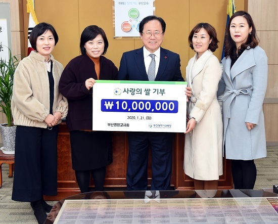 부산시광역시교육청(교육감 김석준)은 1월 21일 오후 3시 교육감실에서 부산영양교사회(회장 박정미)로부터 1,000만원 상당의 쌀을 전달받았다.