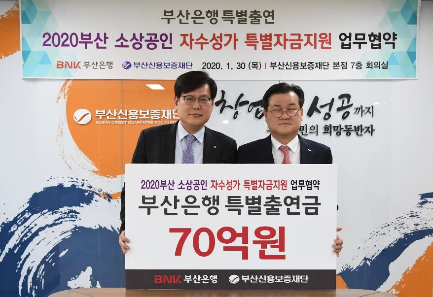 BNK부산은행은 30일 오후 부산신용보증재단 본점에서 ‘2020 부산 소상공인 자수성가 특별자금 지원 업무협약’을 체결했다.