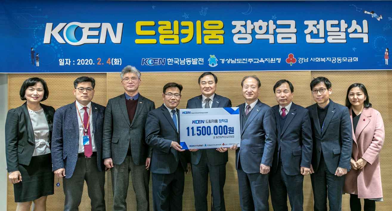 한국남동발전은 지난 4일 진주 본사에서 김학빈 기획관리본부장, 심낙섭 경상남도 진주교육지원청 교육장, 유병설 경남사회복지공동모금회 사무처장 등 관계자 10여명이 참석한 가운데 ‘KOEN 드림키움 장학사업’의 장학금 전달식을 가졌다.