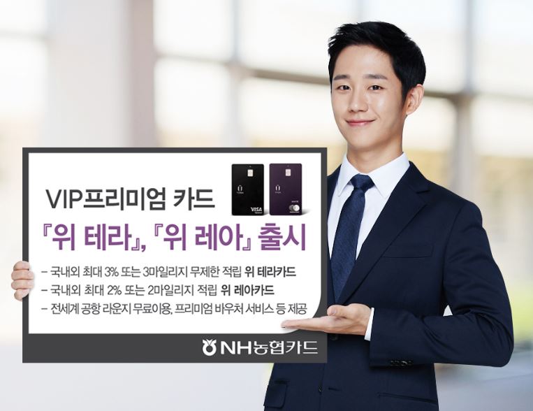 한편 NH농협카드는 카드 정식 출시에 앞서 배우 정해인을 프리미엄카드 1호 발급자로 선정하고 지난달 30일 서울 중구 소재 농협은행 본점에서 기념행사를 열었다. 이날 정해인은 최상의 프리미엄 혜택을 제공하는 “위 테라카드”에 첫 번째로 가입해 1호 발급자가 됐다.