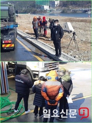 노동단체가 카메라 촬영을 하고 있는 모습(위), 거제시청 공무원 현장 확인 장면(아래).