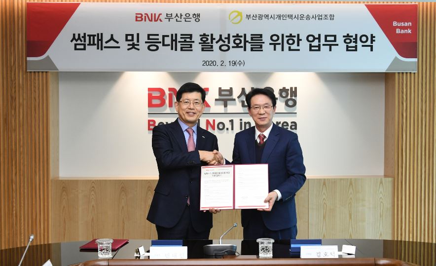 BNK부산은행은 지난 19일 오전 부산은행 본점에서 부산광역시개인택시운송사업조합과 ‘썸패스 및 등대콜 활성화를 위한 업무협약’을 체결했다.
