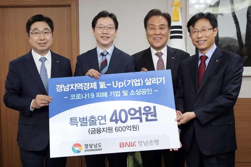 특히 중소기업 및 소상공인 부문 코로나19 피해 금융지원 출연은 울산광역시(25일)와도 병행, BNK경남은행이 67억원을 특별출연하고 경상남도ㆍ경남신용보증재단ㆍ울산광역시ㆍ울산신용보증재단이 보증해 약 1000억원 규모로 금융지원 한다.