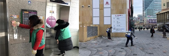 ▲ 다누림센터 엘리베이터 소독 ▲ 서부시외버스터미널 주변 방역