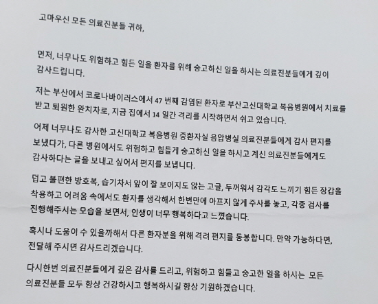 부산-47번 환자가 의료진에게 보낸 편지
