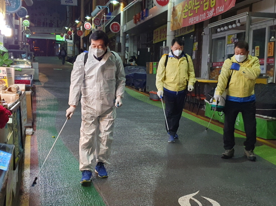제21대 국회의원 총선거 김해갑 선거구에 출마한 더불어민주당 민홍철 예비후보가 지난 7일부터 취약 지역에 대해 방역 소독을 펼치고 있다.<사진> 코로나19 확산을 막고 시민의 건강을 지키기 위해서다.