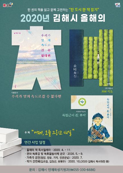 김해시와 ‘올해의 책 추진협의회’는 지난달 6일 ‘어제, 오늘 그리고 내일’이라는 주제 아래 ▲대표도서로 김초엽 작가의 ‘우리가 빛의 속도로 갈 수 없다면(허블, 2019)’ ▲어린이도서로 김정선 작가의 ‘숨바꼭질(사계절, 2018)’ ▲시민작가도서로 유행두 작가의 ‘독립군이 된 류타(키다리, 2019)’를 선정했다.