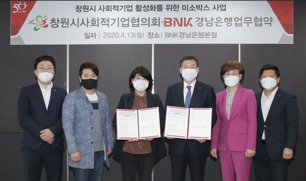 BNK경남은행은 13일 창원시 사회적기업협의회(회장 조임경)와 ‘창원시 사회적기업 활성화를 위한 미소박스 업무 협약’을 체결했다.
