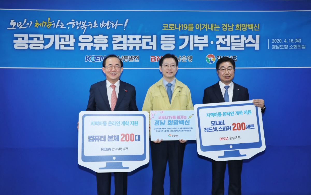 [경남=일요신문] 김희준 기자 = 한국남동발전(사장 유향열)은 16일 경상남도청에서 김경수 경상남도지사, 유향열 한국남동발전 사장, 황윤철 BNK경남은행장 등이 참석한 가운데 코로나19의 장기화로 인한 온라인 개학에 대비해야 하는 저소득층 학생들을 위해 리뉴얼 컴퓨터 200대를 전달했다고 밝혔다.