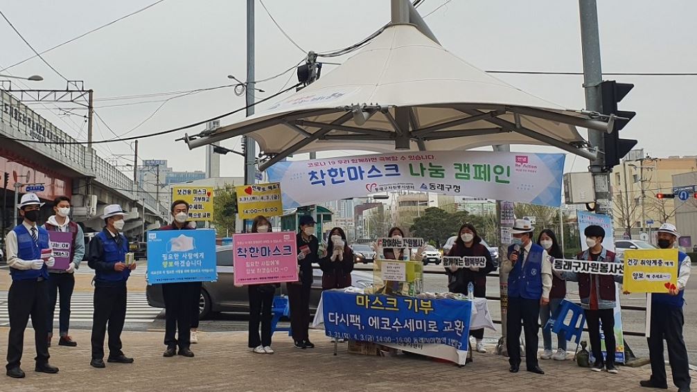 코로나19 극복을 위한 다양한 캠페인을 진행하고 있는 동래구자원봉사센터는 지난 3월말 동래역 1번 출구 앞에서 ‘착한 마스크 나눔 캠페인’을 진행해 지역주민들이 가지고 있던 보건용 마스크(KF80·94) 176장을 기증받았다. 특히 당일 마스크를 기증해준 지역주민들에게는 동래구 자원봉사자들이 직접 제작한 다시용 팩과 에코수세미를 선물로 나눠줘 큰 호응을 얻었다.