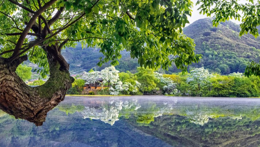 밀양 위양못= 저수지 가운데 5개의 작은 섬과 완재정이라는 정자가 있다. 진귀한 나무들이 즐비하고 이팝나무 꽃이 만발하는 5월이 되면 그 아름다움이 절정을 이룬다.