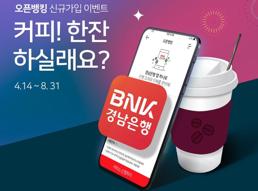오픈뱅킹 서비스 신규가입 이벤트 기간 BNK경남은행모바일뱅킹앱(App)을 이용해 오픈뱅킹 서비스에 신규 가입하면 매월 100명 총 500명을 추첨해 모바일 커피 기프티콘을 보내준다.