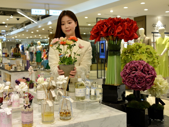 롯데백화점 부산본점 2층 에르베감스 매장에서는 실내 분위기 전환에 필요한 조화를 선보이고 있다.<사진>