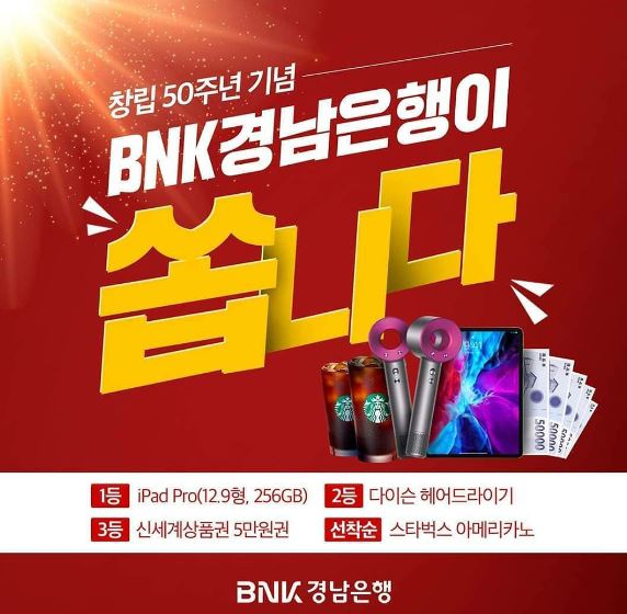 BNK경남은행은 창립 50주년을 기념해 오는 23일까지 ‘모바일뱅킹 신규 고객 웰컴 이벤트’를 진행한다.