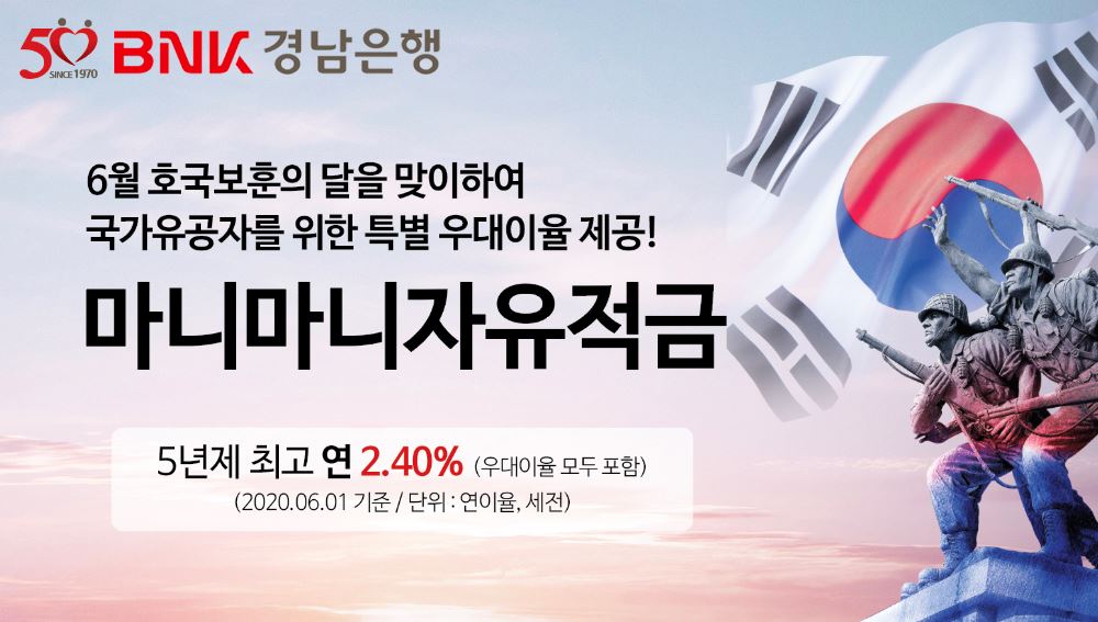 BNK경남은행은 6월 호국보훈의 달을 맞아 국가유공자와 유족, 그리고 현역 군인에게 특별 우대이율을 제공한다고 밝혔다.