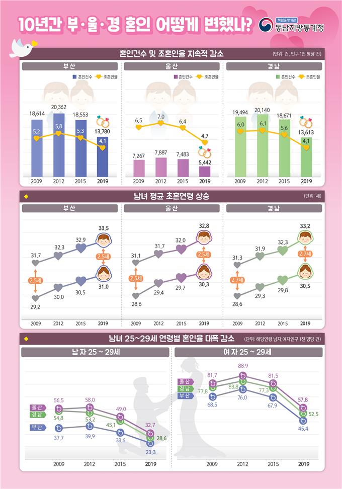10년(2009~2019) 전 대비 혼인 건수가 부산 26.0%, 울산 25.1%, 경남 30.2%씩이나 각각 줄었다. 조혼인율은 부산 4.1건, 울산 4.7건, 경남 4.1건으로 10년 전보다 각각 1.1건, 1.8건, 1.9건씩 감소했다.