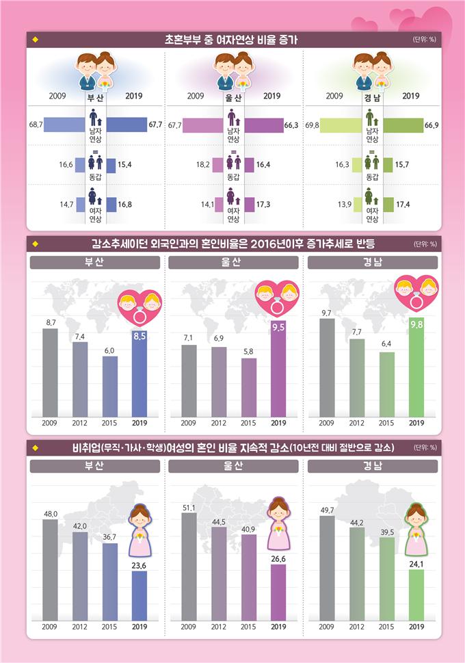 10년 전 대비 초혼 부부 중 여자연상 부부의 비율도 늘었다. 여자연상 비율은 부산 2.1%p(14.7%→16.8%), 울산 3.2%p(14.1%→17.3%), 경남 3.5%p(13.9%→17.4%)로 모두 증가했다. 남자가 연상이거나 동갑인 부부는 0.6~2.9%p 감소했다.