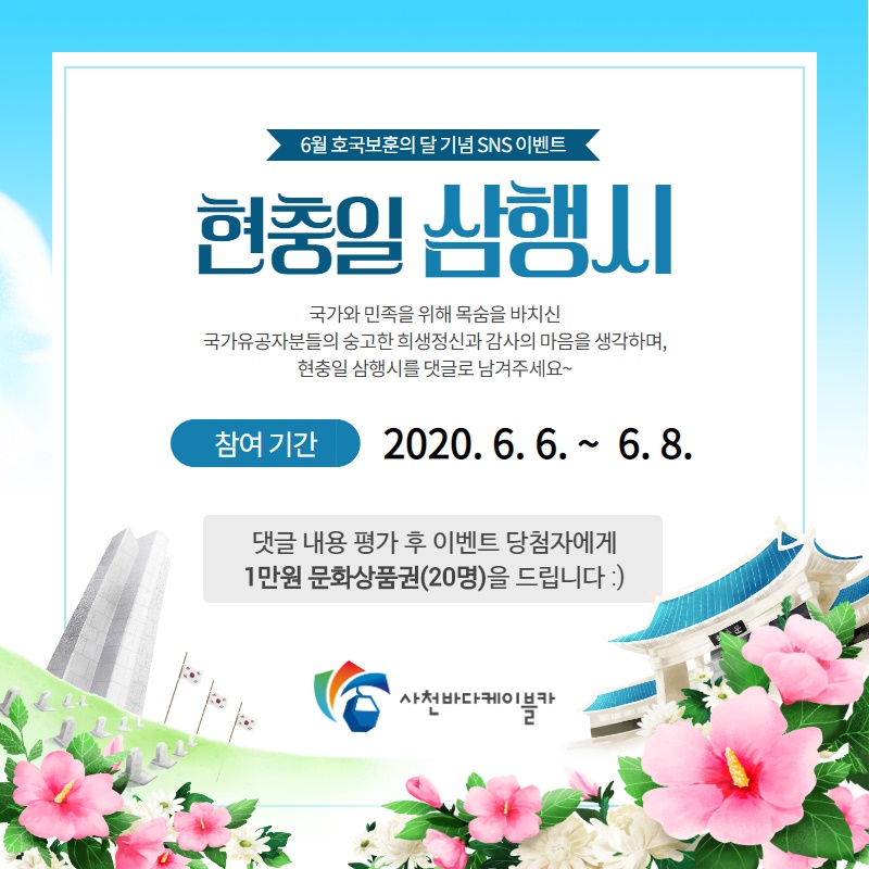 먼저, 6월 6일부터 8일까지 3일간 ‘호국보훈의 달 기념 현충일 삼행시’ 이벤트를 실시한다. 참여방법은 페이스북 또는 인스타그램 공식 계정을 팔로워한 뒤 이벤트 게시물에 국가를 위해 희생하신 분들께 감사의 마음을 담아 ‘현충일’ 삼행시를 지어 댓글로 남기면 된다. 댓글 내용과 기타 준수사항을 평가한 후 1만 원 상당의 문화상품권을 20명에게 제공한다.