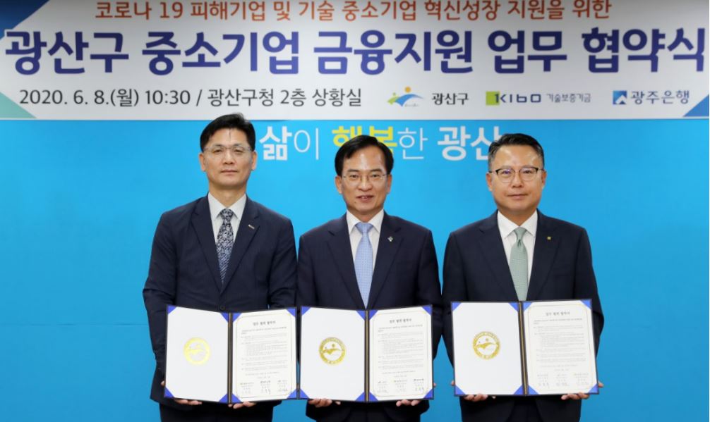 기술보증기금(이사장 정윤모, 이하 기보)은 광산구청(구청장 김삼호), 광주은행(은행장 송종욱)과 지난 8일 광주광역시 광산구청에서 ‘기술중소기업 금융지원을 위한 업무협약’을 체결했다.