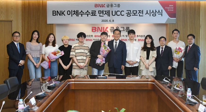 BNK금융그룹이 8일 오후, 본사에서 ‘인터넷·모바일뱅킹 이체수수료 면제’를 주제로 진행한 UCC 공모전의 시상식을 개최했다. (사진 오른쪽 여섯번째부터 BNK금융그룹 김지완 회장, BNK대상 수상자 강범철씨)