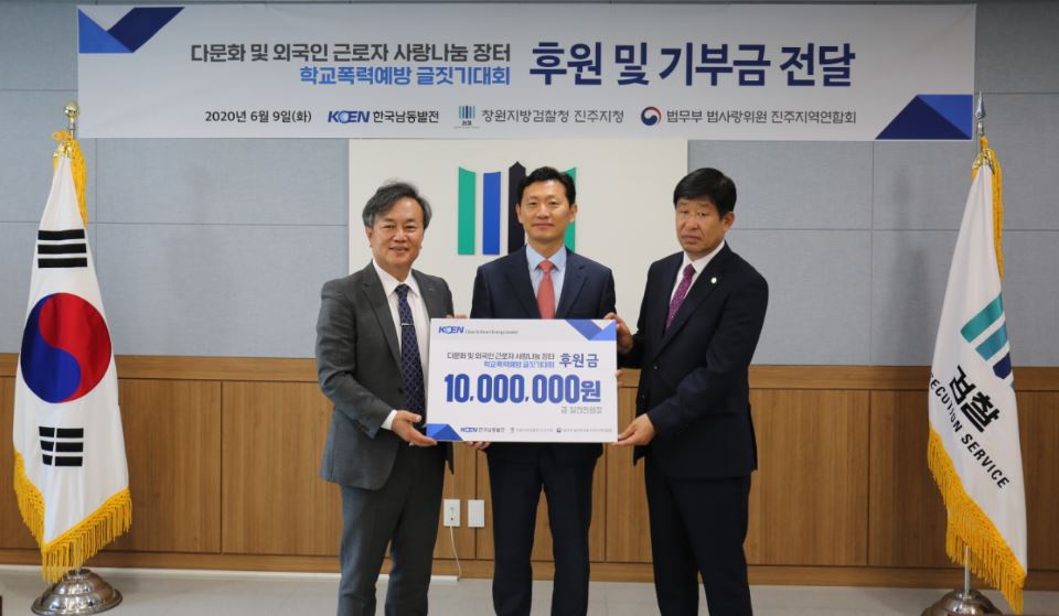 KOEN 한국남동발전(사장 유향열)은 지난 9일 창원지방검찰청 진주지청에서 ‘다문화 및 외국인근로자 사랑나눔장터’와 ‘학교폭력예방 글짓기 대회’ 후원을 위한 기부금을 전달했다.