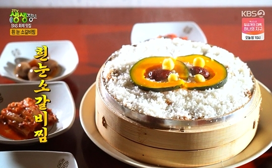 소갈비찜 위에 찹쌀가루가 잔뜩 올라가 마치 흰눈이 내린 것처럼 보인다.