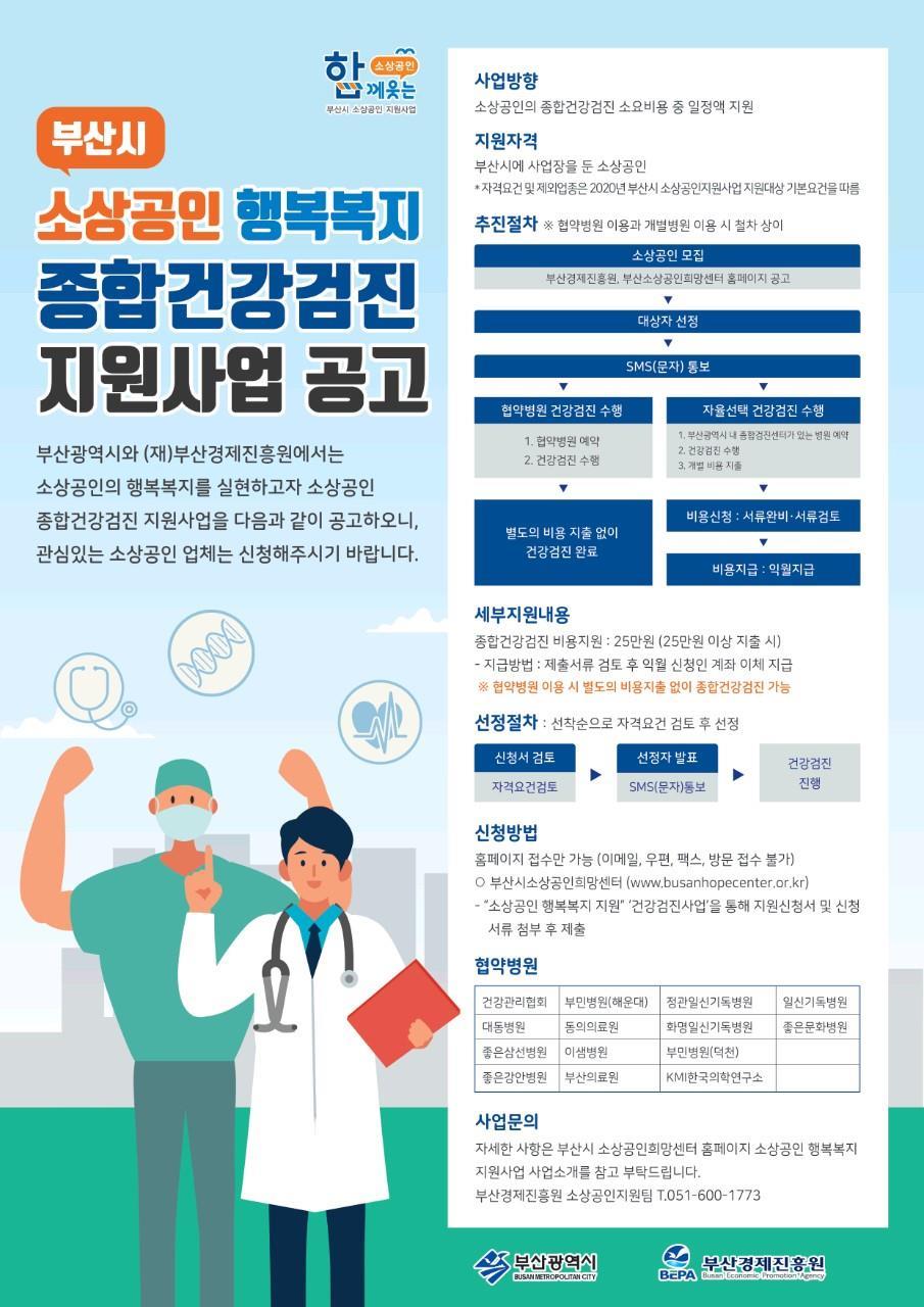 부산시(시장 권한대행 변성완)는 코로나19로 힘든 시기를 보내고 있는 지역 소상공인들을 위해 소상공업체 284개소에 종합건강검진 비용 각 25만 원씩을 지원한다고 밝혔다.