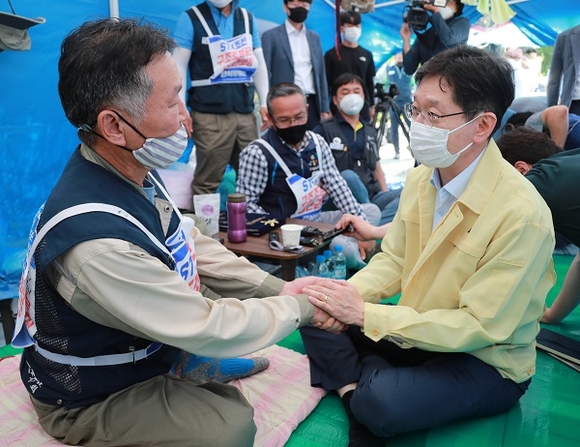 이 지회장과 류조환 민주노총경남본부장 등 노조원들을 위로한 김 지사는 “도 입장에서도 도민의 안정적인 일자리를 지키는 것이 무엇보다 중요하다”면서 “단식을 풀고 기운을 차려 함께 해법을 찾아가자”고 이야기를 시작했다.