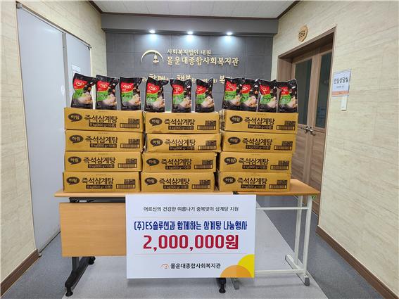 [부산=일요신문] 인공지능 영상데이터 처리그룹 ㈜ES솔루션(대표이사 서민화)은 중복을 맞아 삼계탕 228팩<사진>을 부산 사하구 다대동의 몰운대사회복지관에 기부했다고 20일 밝혔다.