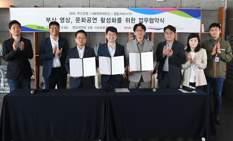 BNK부산은행은 지난 21일 영화의전당 시네라운지에서 (재)영화의전당 및 문화/공연 매니지먼트 전문회사 클립서비스(주)와 ‘부산 영상·문화공연 활성화 업무 협약’을 체결했다.