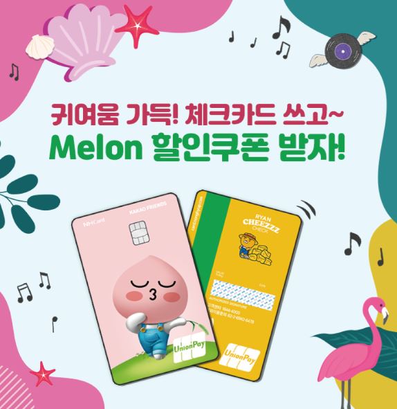 이벤트 대상은 라이언 치즈, 어피치 스윗 체크카드(유니온페이)를 소지한 회원이며, 10만원 이상 해당카드 이용 및 이벤트 응모 시 추첨을 통해 ‘멜론 할인쿠폰’을 1,000명에게 제공한다.