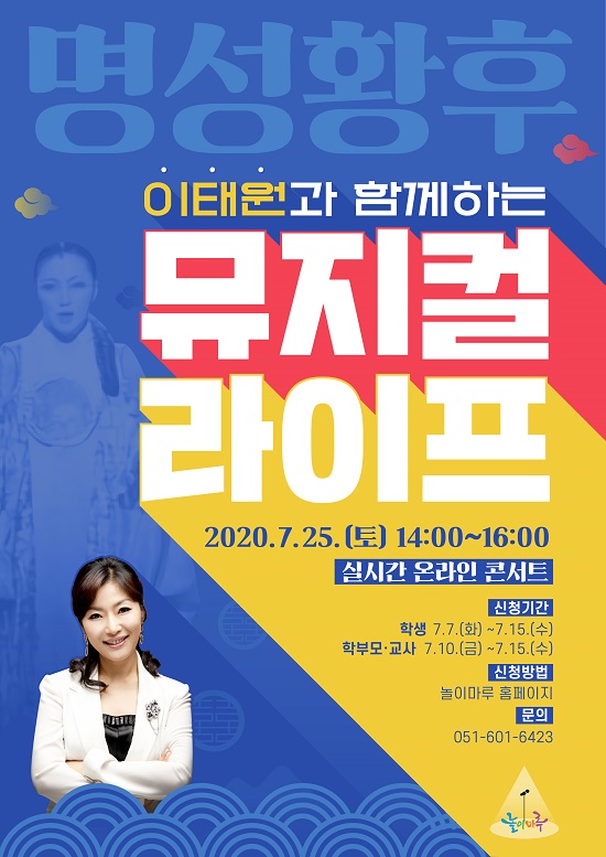 부산광역시교육청(교육감 김석준) 놀이마루는 25일 오후 2시부터 2시간 동안 초등학교 5학년∼고등학교 3학년 학생과 학부모, 교직원 등을 대상으로‘명성황후 이태원과 함께 하는 뮤지컬 라이프’를 주제로 올해 첫 인문학 콘서트를 개최한다.
