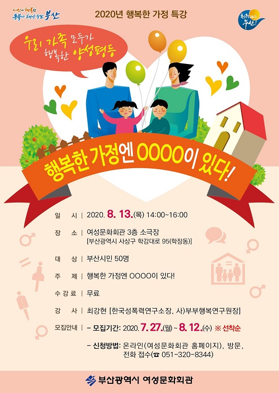 부산시 여성문화회관은 가족구성원 상호 간의 소통 및 관계 향상을 위해 오는 8월 13일 오후 2시부터 ‘2020년 행복한 가정 특강’을 진행한다고 밝혔다.
