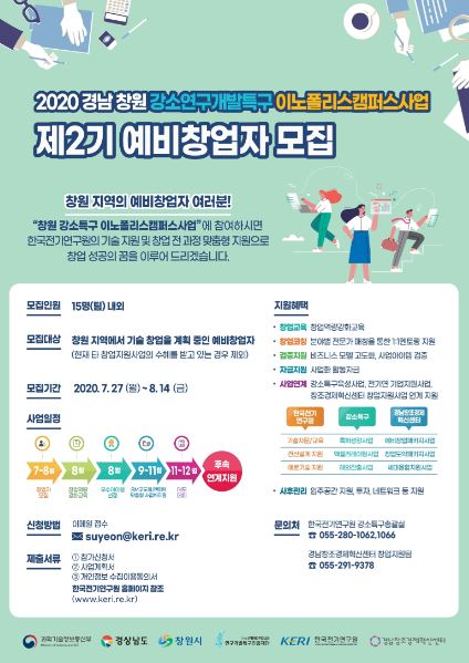 과학기술정보통신부 국가과학기술연구회 산하 전기전문 연구기관인 한국전기연구원(KERI·원장 최규하)이 경남 창원지역의 예비 창업자를 육성하기 위해 시행하는 ‘2020 경남 창원 강소연구개발특구 이노폴리스캠퍼스사업’ 제2기 참여자를 27일부터 내달 14일까지 모집한다.