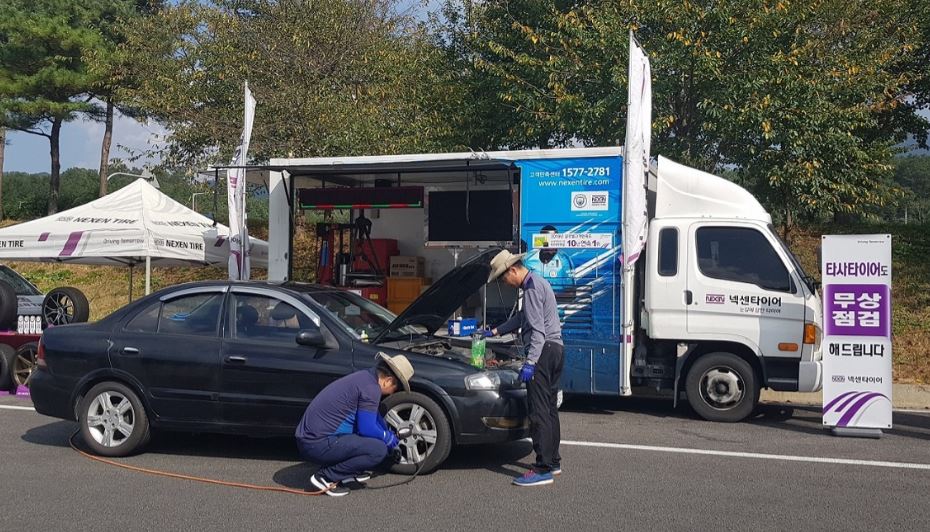 넥센타이어는 타이어 전문 인력과 3.5t 모바일 점검 차량을 활용해 타이어 공기압과 마모 상태 등을 확인하고, 워셔액 보충, 차량 실내 소독 등의 서비스를 무상으로 제공한다.